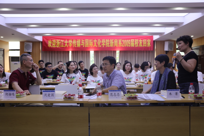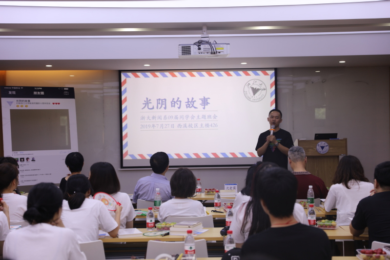 7月27日,浙江大學(xué)傳媒與國際文化學(xué)院新聞系09屆校友們相聚浙大校園,共赴一場十年之約。上午校友們約定在紫金港校區(qū)集合,一起游覽紫金港校區(qū)。臨近中午,同學(xué)們結(jié)伴來到西溪校區(qū),換上印有學(xué)校Logo的文化衫,翻出當(dāng)年的畢業(yè)合影,在教學(xué)主樓426會議室重溫課堂記憶。