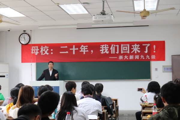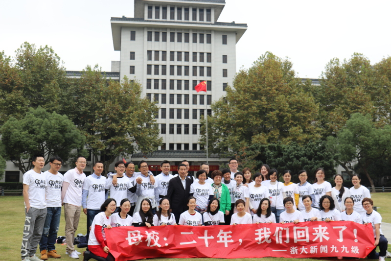 ”春天的花開秋天的風(fēng)以及冬天的落陽,憂郁的青春年少的我曾經(jīng)無知的這么想……”一首光陰的故事勾起了多少人的回憶,也把九九級新聞班的同學(xué)們帶回到了他們最美好的大學(xué)時光。2019年10月26日,九九級新聞班的同學(xué)們重回浙江大學(xué)西溪校區(qū),20年前他們踏上這邊土地開始求學(xué)求知的大學(xué)時光,20年后,他們重回故土回首曾經(jīng)的青蔥歲月,分享畢業(yè)后的酸甜苦辣。早上10點(diǎn)不到,西溪校區(qū)田家炳樓204號教室已經(jīng)坐滿身著班服的同學(xué)們,教室里充滿了歡聲笑語,同學(xué)們特地邀請了易容老師、張夢新老師、張英華老師。