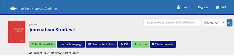 《新聞研究》(Journalism Studies)學(xué)刊由泰勒-弗朗西斯出版集團(tuán)旗下的勞特利奇出版社出版,是新聞研究領(lǐng)域的旗艦刊物。該刊被SSCI等數(shù)據(jù)庫收錄,2019年的影響因子為2.345,處在Q2區(qū)間。《新聞研究》學(xué)刊現(xiàn)任主編為維也納大學(xué)Folker Hanusch教授,編委會由來自全世界30多個(gè)國家的數(shù)十位學(xué)者構(gòu)成,其中既有新聞研究領(lǐng)域的資深學(xué)者,也有國際學(xué)術(shù)界活躍的新生代研究者。