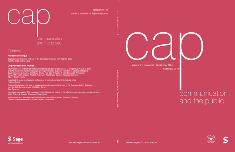 2024-10-25Communication and the Public 創(chuàng)刊于2016年春季,由浙江大學(xué)和SAGE聯(lián)合出版,面向全球發(fā)行,是中國大陸新聞傳播學(xué)科第一本真正同行評議的英文學(xué)術(shù)期刊。自創(chuàng)刊以來,本刊共舉辦八次“傳播與公共”國際學(xué)術(shù)研討會,在國內(nèi)外學(xué)術(shù)界引起廣泛關(guān)注。目前,本刊分別于2018年、2019年被Scopus和ESCI數(shù)據(jù)庫收錄,并在2022年獲得法國傳播學(xué)期刊評級,被收錄在法國信息傳播學(xué)核心期刊索引和核心隊(duì)列。從2023年9月起,本刊正式轉(zhuǎn)為OA期刊,全面開放獲取。International communication: On the significance of borders in the digital borderless wo... 更多 -